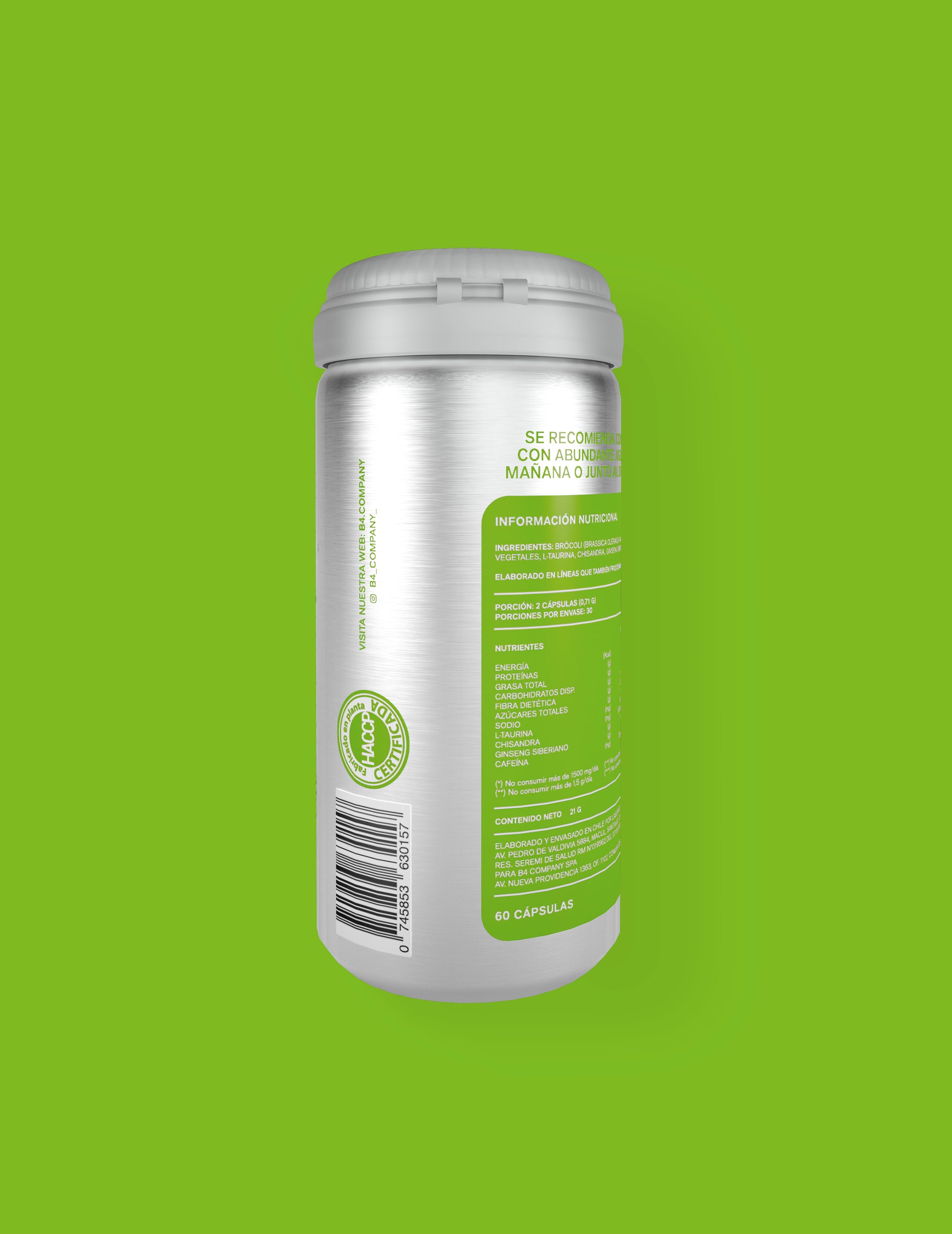 Brócoli (Brassica oleracea var. Itálica), cápsulas vegetales, L-Taurina, chisandra, ginseng siberiano, cafeína. Elaborado en líneas que también procesan soya.